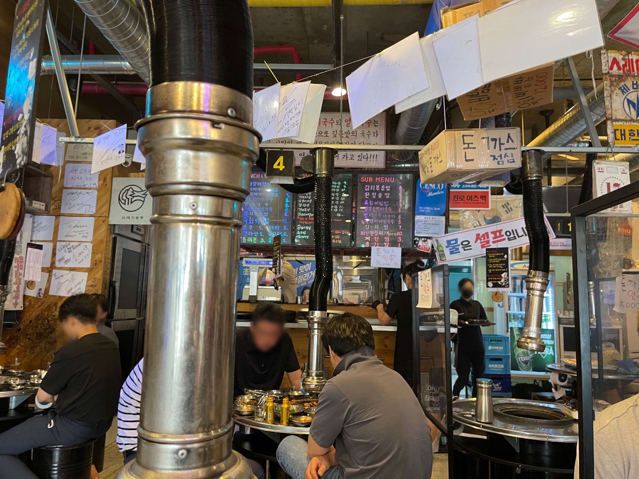 테이블 마다 바쁘게 고기를 굽고 있어요.